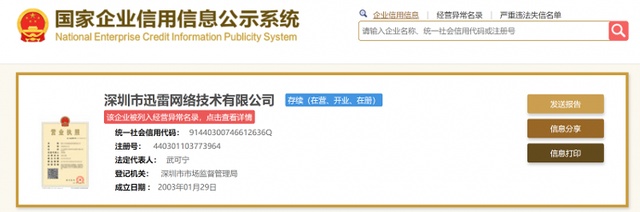 5月9日,深圳市迅雷网络技术有限公司(以下简称迅雷)因未按规定期限公示2021年年度报告,被列入经营异常名录引发关注。大众网·海报新闻记者登录国家企业信用信息公示系统查询显示,深圳市迅雷网络技术有限公司因未按规定期限公示2021年年度报告被列入经营异常公司名录,决定机关为深圳市市场和质量监督管理委员会南山局。