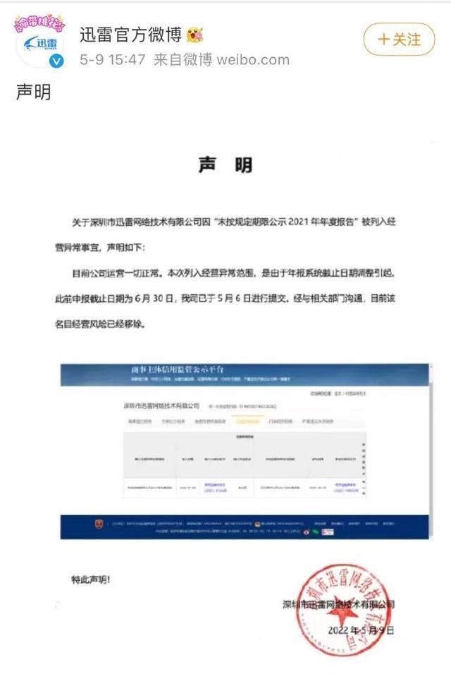 针对此事,大众网·海报新闻记者试图联系迅雷方面,但未获回应。记者注意到,迅雷在其官方微博就因“未按规定期限公示2021年年度报告”被列入经营异常一事发布声明称:目前公司运营一切正常。本次列入经营异常范围,是由于年报系统截止日期调整引起。此前申报截止日期为6月30日,公司已于5月6日进行提交。经与相关部门沟通,目前该名目经营风险已经移除。