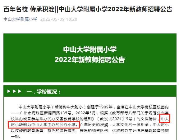 5月9日,中山大学附属小学(以下简称为“中大附小”)发布2022年新教师招聘公告,其中提及2022年5月,根据相关文件精神,中大附小转制为中山大学主办的公办小学。