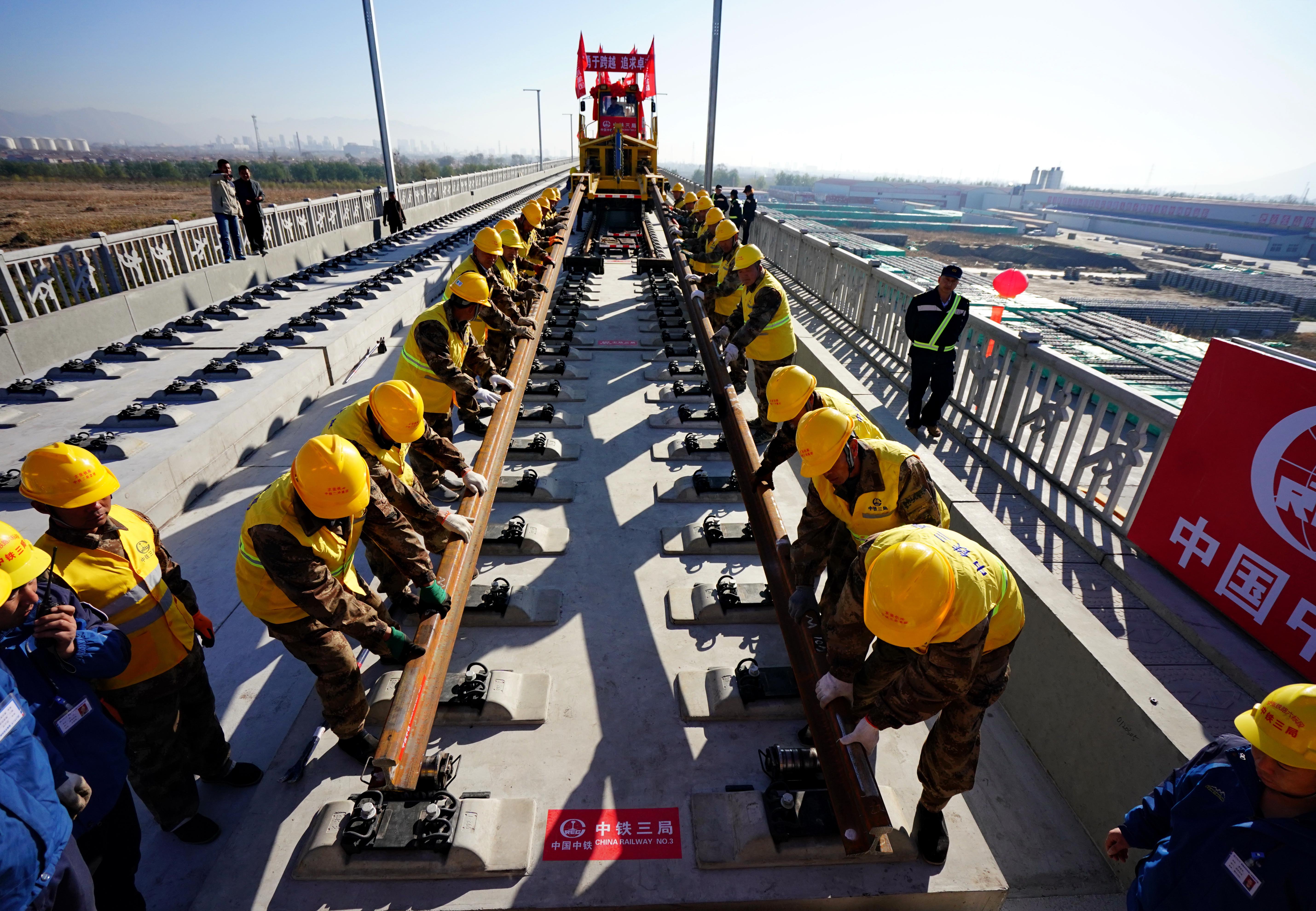 2018年11月1日,京张高铁河北怀来段铺轨现场,工人们铺下京张高铁全线第一节轨排。(资料图片)新华社发