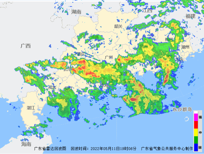 截至5月11日20时02分,云浮、佛山、江门、珠海、中山、东莞、惠州附近降水较强,广东多地发布暴雨预警生效中。