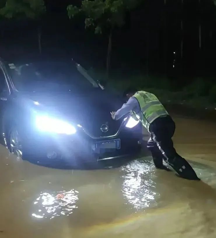 5月10日,惠州龙门县突降暴雨。当晚21时30分,龙门县公安局交警大队执勤民警在水头园桥头路段巡逻时,一名群众跑来求助称,自己驾驶的车辆在经过积水较深的路段后无法启动,现正浸泡在积水中。民警赶到现场后发现,积水深度已到达膝盖位置,车辆难以通行。