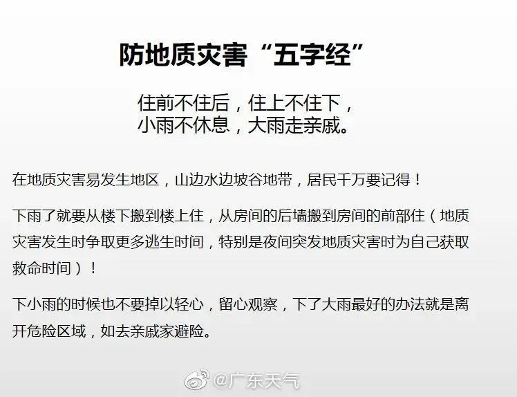 @广东天气提醒,目前广东暴雨持续,连日降雨已导致土壤含水量高,地质灾害风险高,滑坡、泥石流、塌方等灾害极易出现。