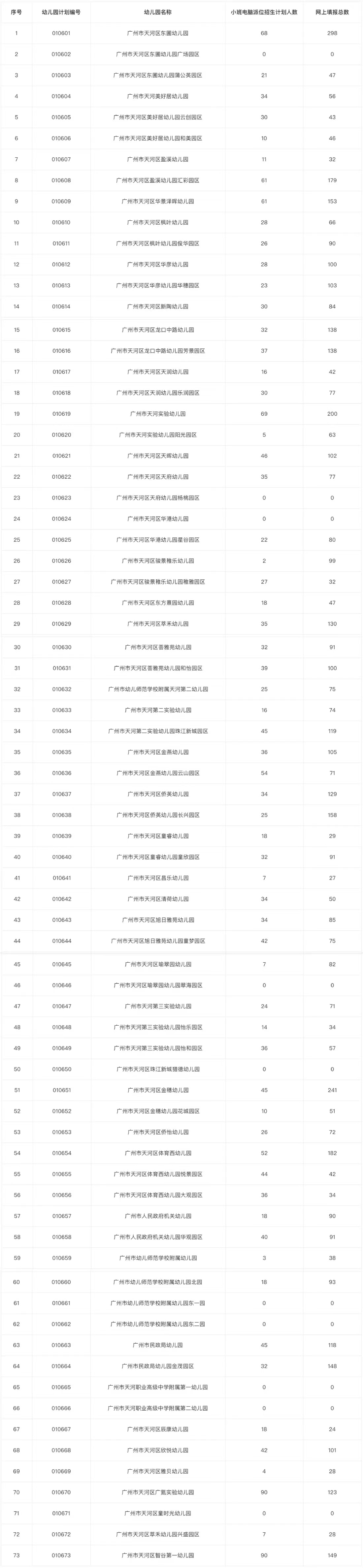 记者从天河区教育局获悉,5月12日,天河区公办幼儿园进行了电脑派位。目前,天河区共有73所区教育部门办的幼儿园(区),根据天河区教育部门办幼儿园电脑派位招生服务平台填报统计显示,全区参与电脑派位学位数为1979个,报名总人数5698人。