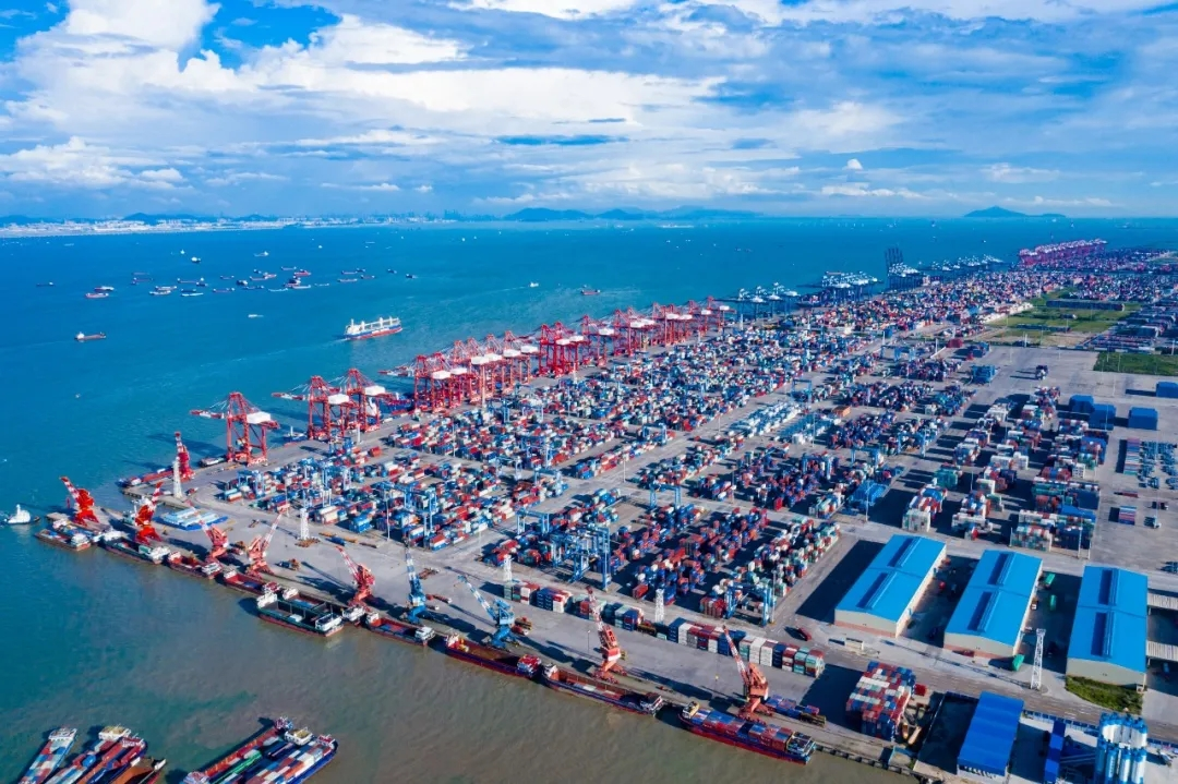 赤橙黄绿蓝靛紫,一摞摞集装箱仿佛一组组活动的色块,流动在忙碌的码头;红白相间的塔吊仿若钢铁巨人,辗转腾挪于一众集装箱之间;在400米长、能容纳2万个标箱的巨轮映衬下,码头上川流不息的装运车辆,就像孩童手中的玩具……