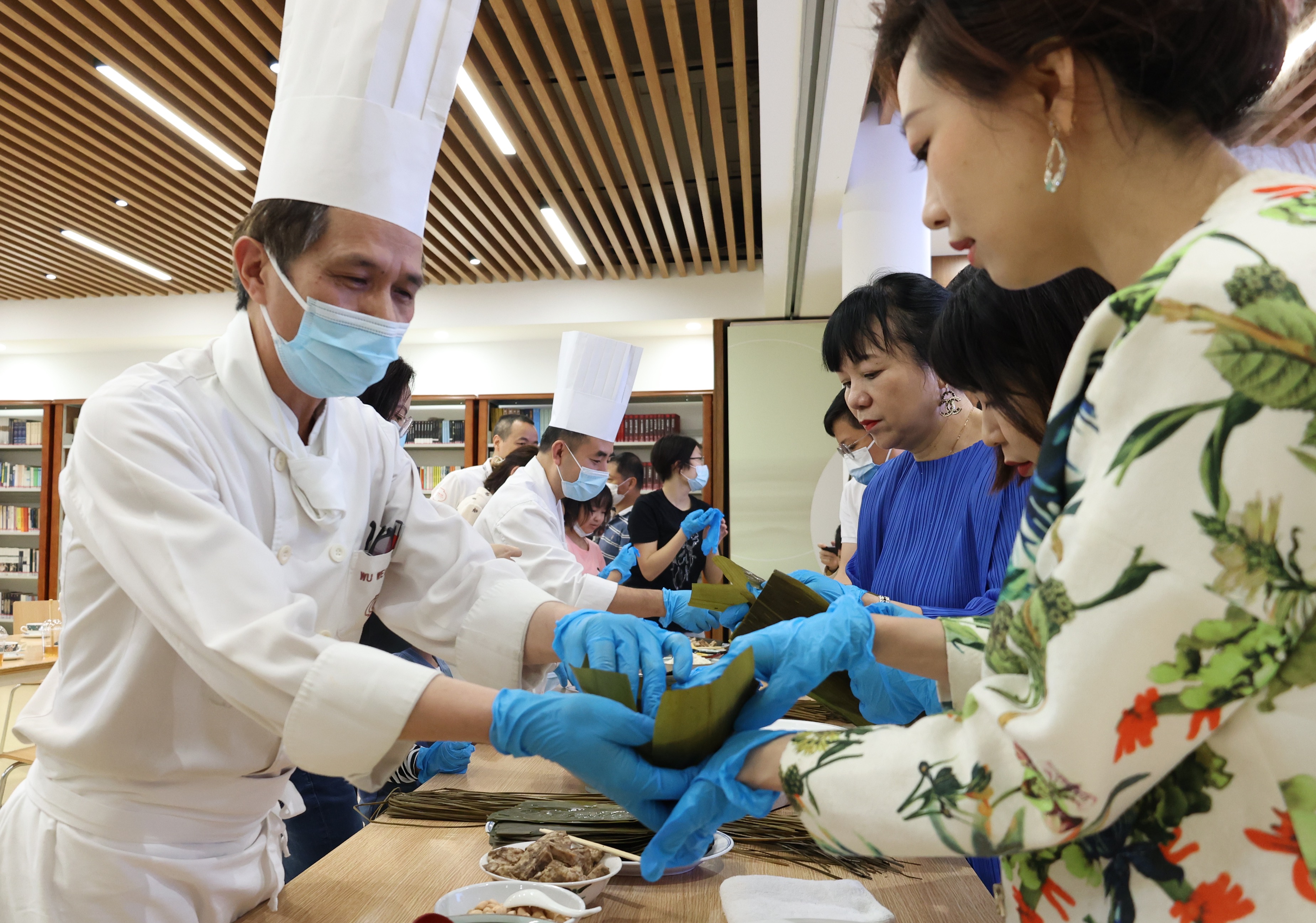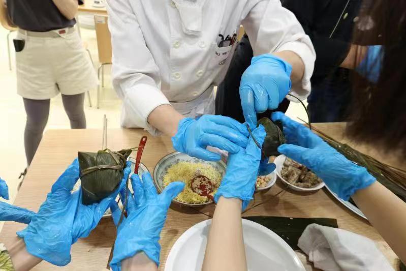 活动中,中国大酒店中餐行政总厨徐锦辉在现场教授观众各类“包粽”技巧,并为观众介绍每一款特色端午粽款式。随着启动仪式的顺利召开,现场的活动也吸引了众多“美食爱好者”的驻足,观众纷纷戴上围裙手套亲自上阵,体验“包粽”带来的乐趣。临近尾声之际,游客纷纷拿起自己DIY的粽子,在镇海楼前、古城墙上打卡拍照。