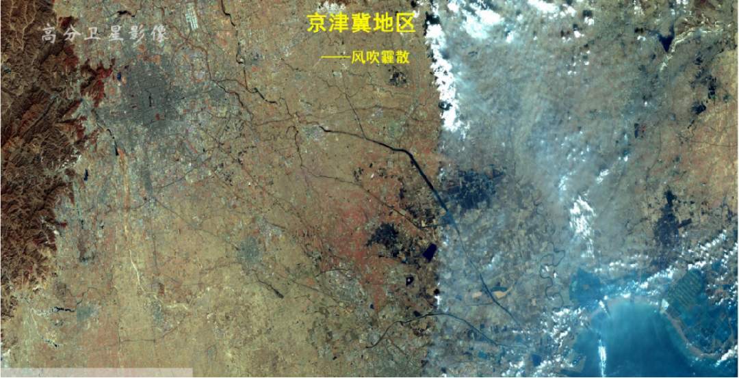 ▲图为2014年3月4日京津冀地区大风吹散雾、霾,由高分一号卫星拍摄。