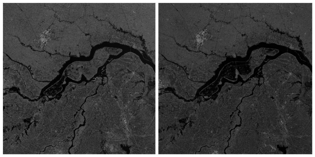 ▲2020年7月20日,淮河王家坝开闸泄洪,在之后开闸的76个小时里,蒙洼蓄洪区共蓄洪3.75亿立方米。通过高分三号卫星之眼,7月20日-21日的蓄洪过程被清晰展现(上图),到7月30日,蒙洼蓄洪区被淹面积153.047平方千米(下图)。