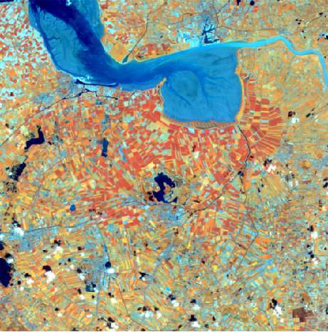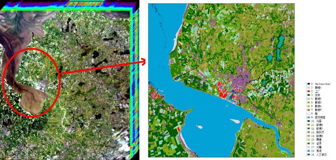 ▲图中放大区域里,展示了海洋、居民点、沼泽、工厂、耕地等地理信息,由高分五号卫星拍摄。