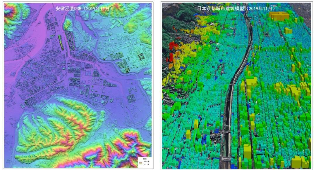 ▲图中从左到右分别为:2019年11月高分七号卫星影像制作的安徽泾县数字地表模型图和日本京都城市建筑模型。