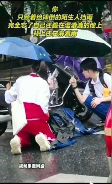 几乎就在向菲朝摔倒市民跑前去的同时,另外一名身穿蓝白色校服的学生,也跑到了滑倒市民的身边,为其拨打了120和报警电话,随即两人一起在雨中为这位摔倒的市民撑伞,大约20分钟后,交警赶到现场她们才离开。