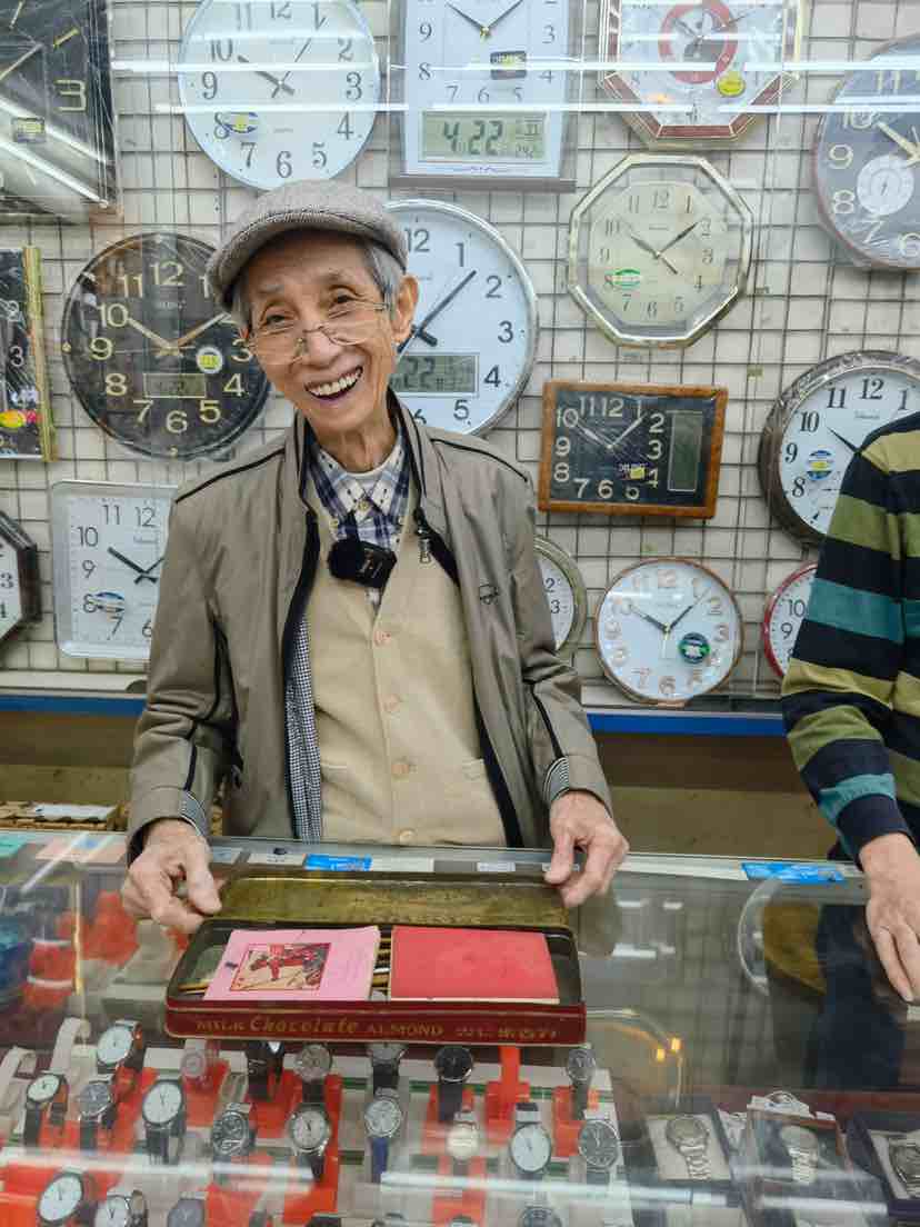 日东钟表行,位于光明南路122号,店面不大,只有10多平方米,两边墙上、玻璃展柜里摆放着琳琅满目的时钟和手表。店内安置着一张老旧的修理工作台,桌上夹着一盏台灯、散落着零零碎碎的手表零件、以及一堆修表工具。与这家小店一样有年代感的是它的掌门人——罗日东。