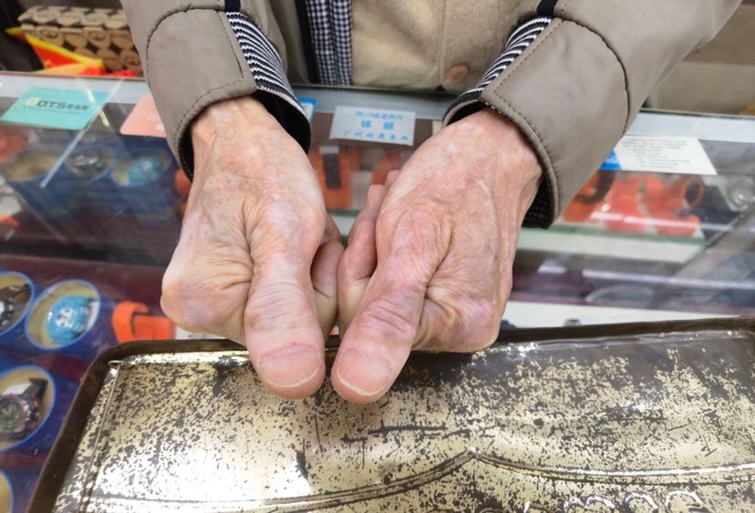 “每次修好的钟表,我们还要接入电脑检测一天左右,一天下来的时间误差尽量控制在10秒以内,我们会尽量调到5秒左右,如果误差值大,我们就要慢慢调,直到调整到误差最少为止。”近70年的岁月磨砺,罗日东双手的拇指因长年累月的按压用力,已变形外翻。“干我们一这行,这么多年下来大都这样,这算是我们行业的一个特色标记了!”罗日东笑着说。