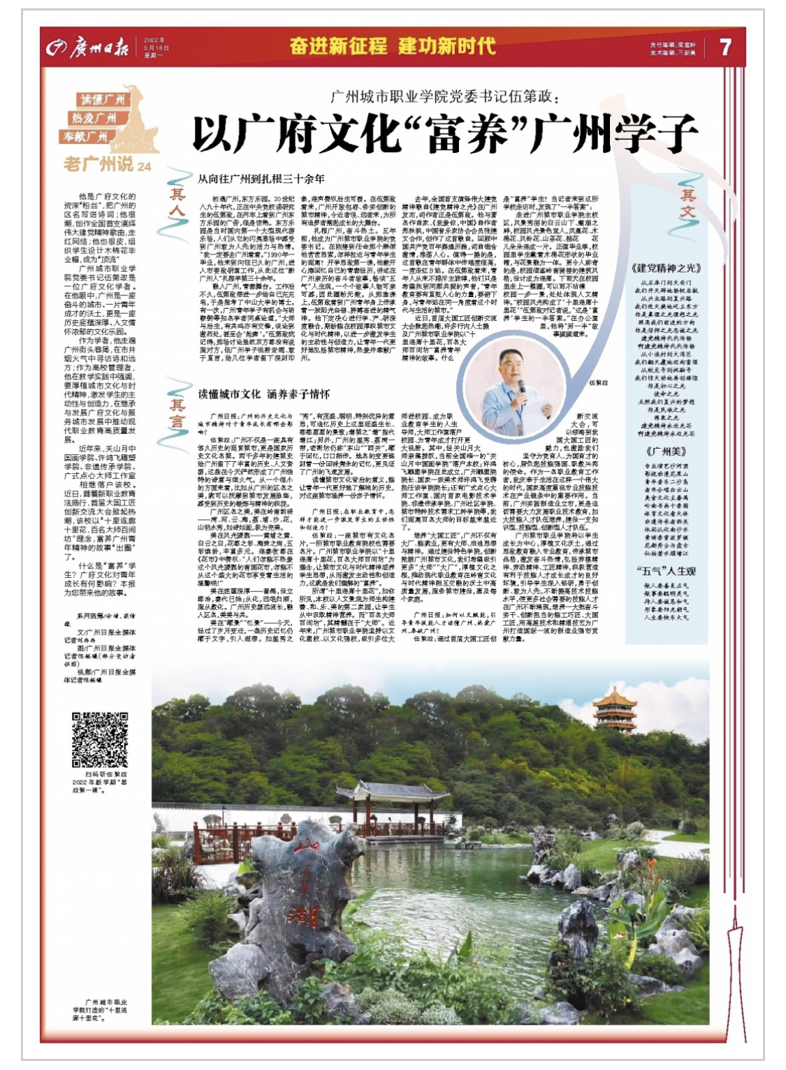 作为学者,他走遍广州街头巷尾,在市井烟火气中寻访诗和远方;作为高校管理者,他在教学实践中强调,要厚植城市文化与时代精神,激发学生的主动性与创造力,在继承与发展广府文化与服务城市发展中推动现代职业教育高质量发展。