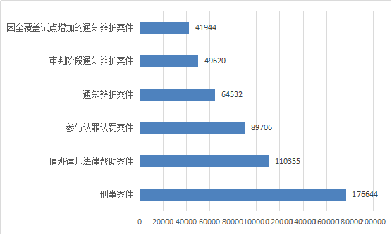 发挥法律援助在以审判为中心刑事诉讼制度改革中的职能作用。深入推进刑事案件律师辩护全覆盖工作,全年组织办理刑事通知辩护法律援助案件和刑事通知法律帮助案件174887件,依法保障没有委托辩护人的被告人获得辩护或法律帮助,有效提高刑事案件律师辩护率。其中,办理审判阶段通知辩护案件49620件,因刑事案件律师辩护全覆盖试点工作增加的通知辩护案件41944件。加强值班律师法律帮助工作,全年办理值班律师法律帮助案件110355件,其中参与认罪认罚案件89706件。