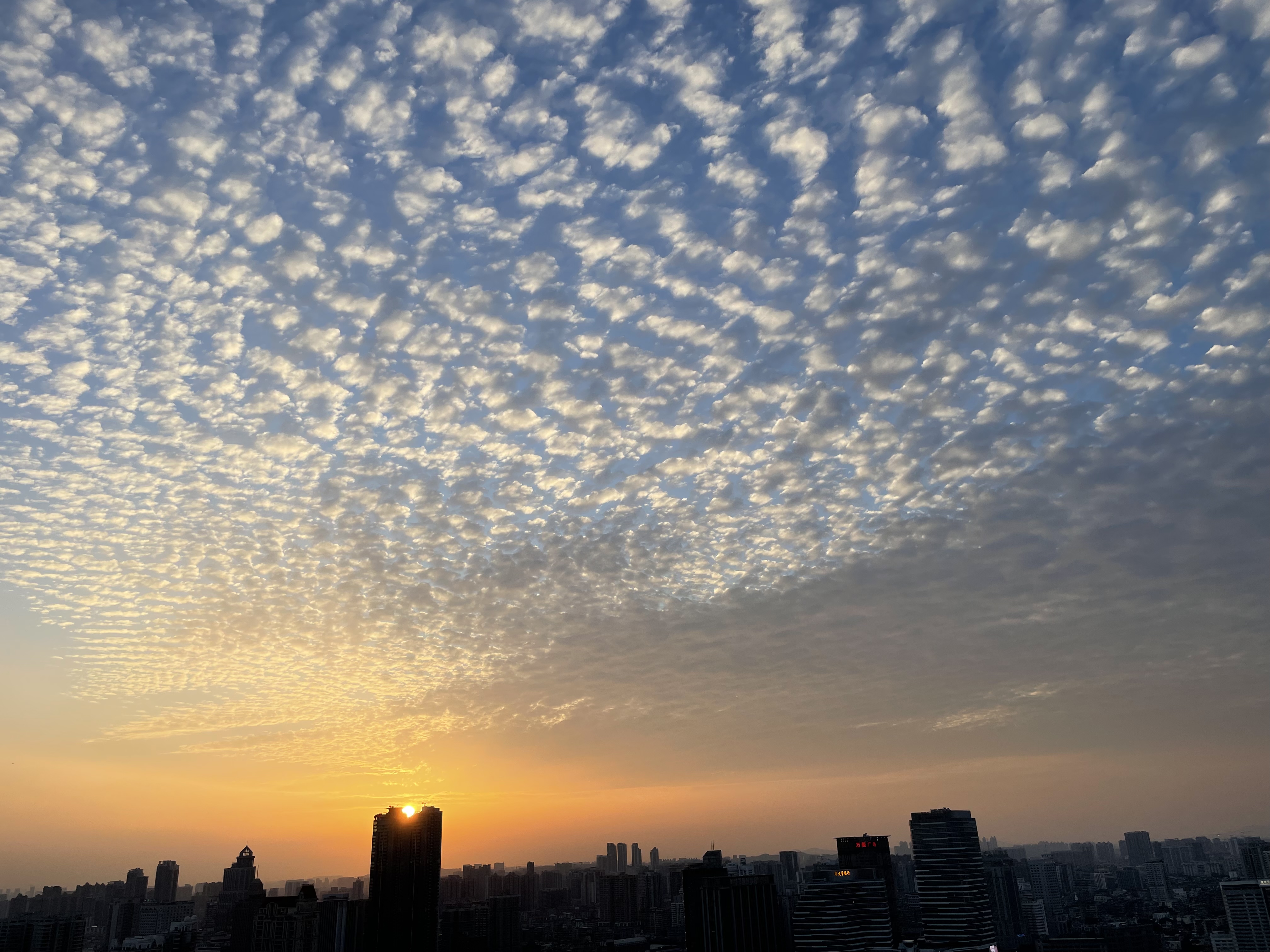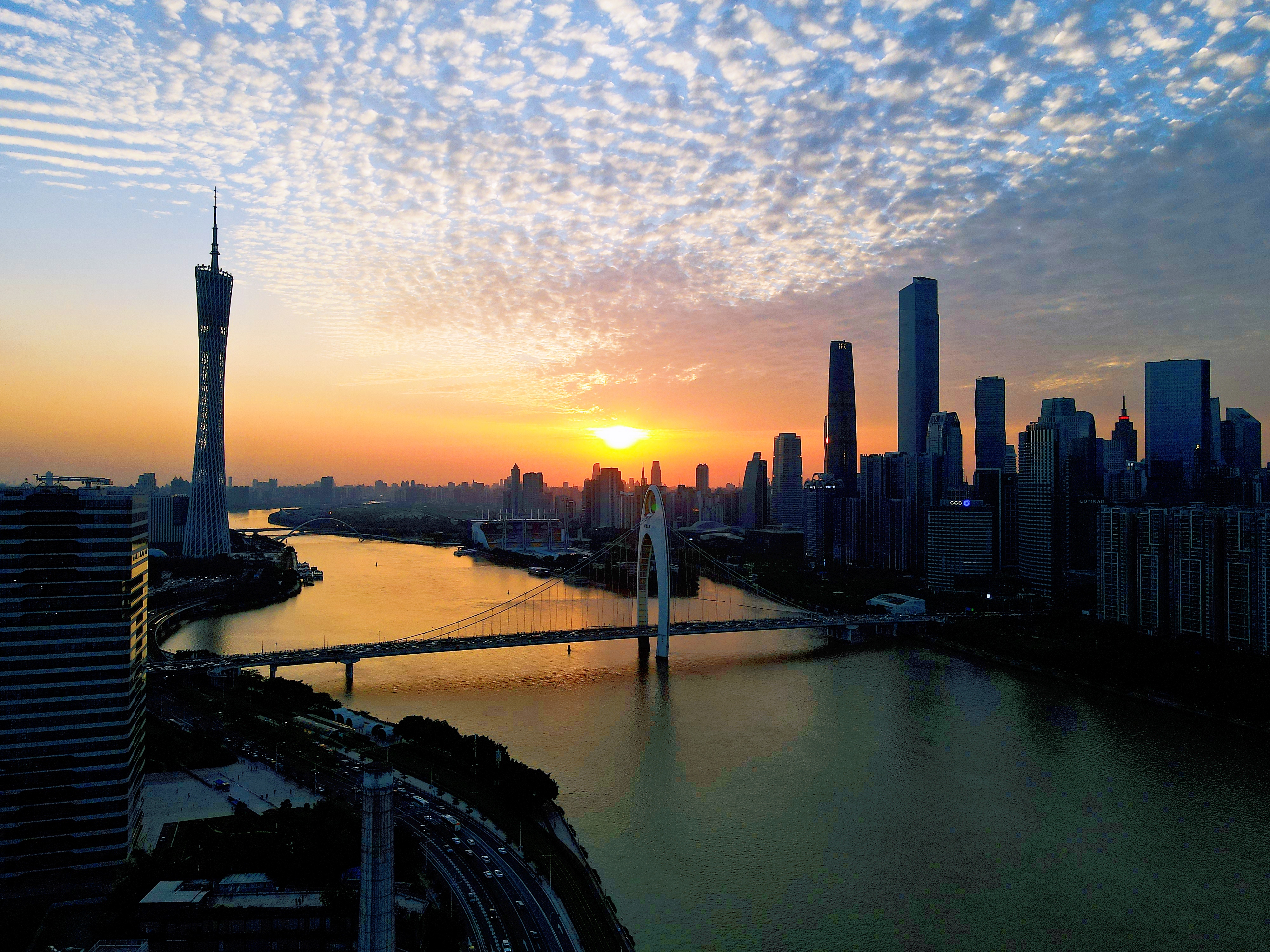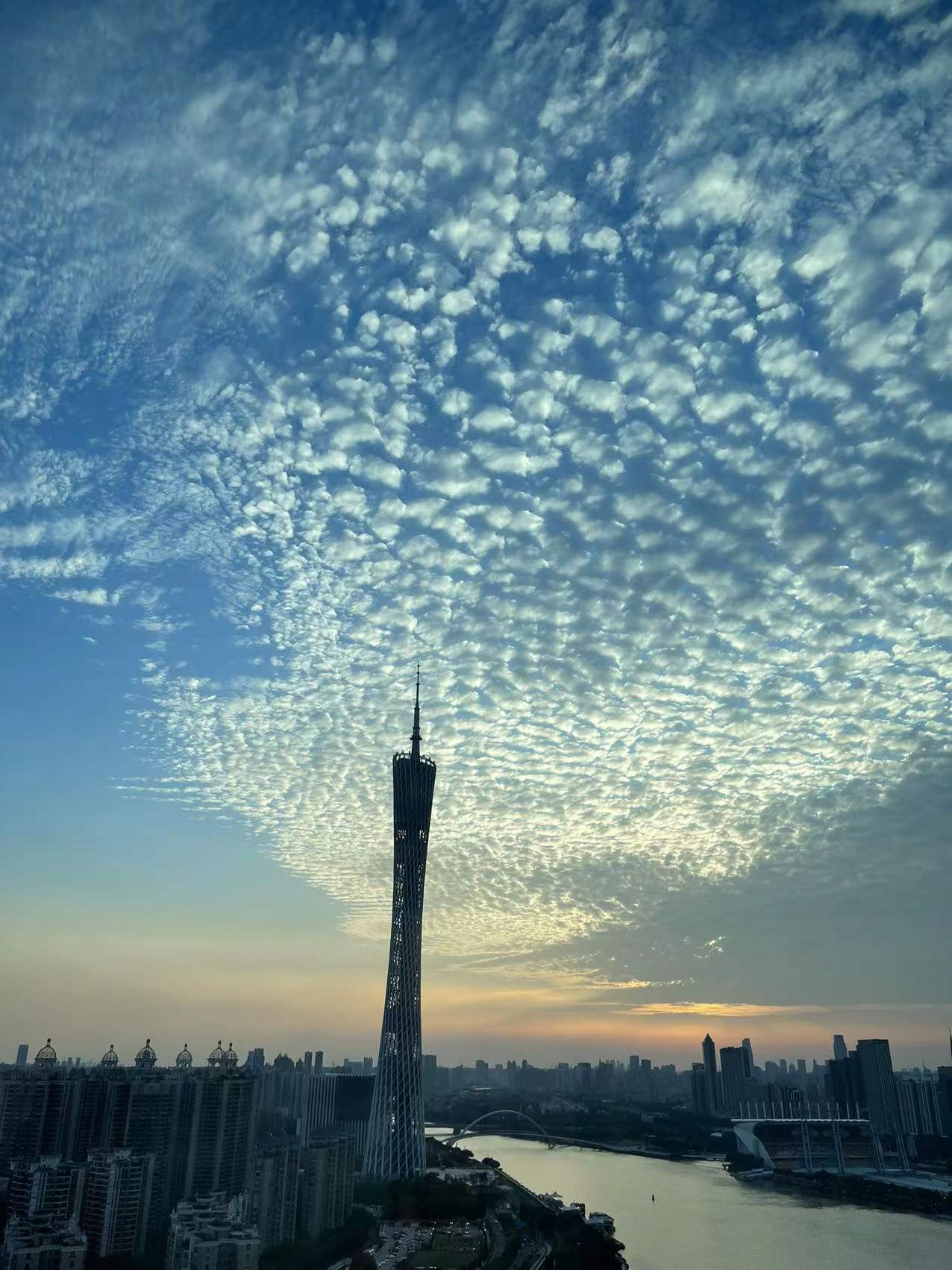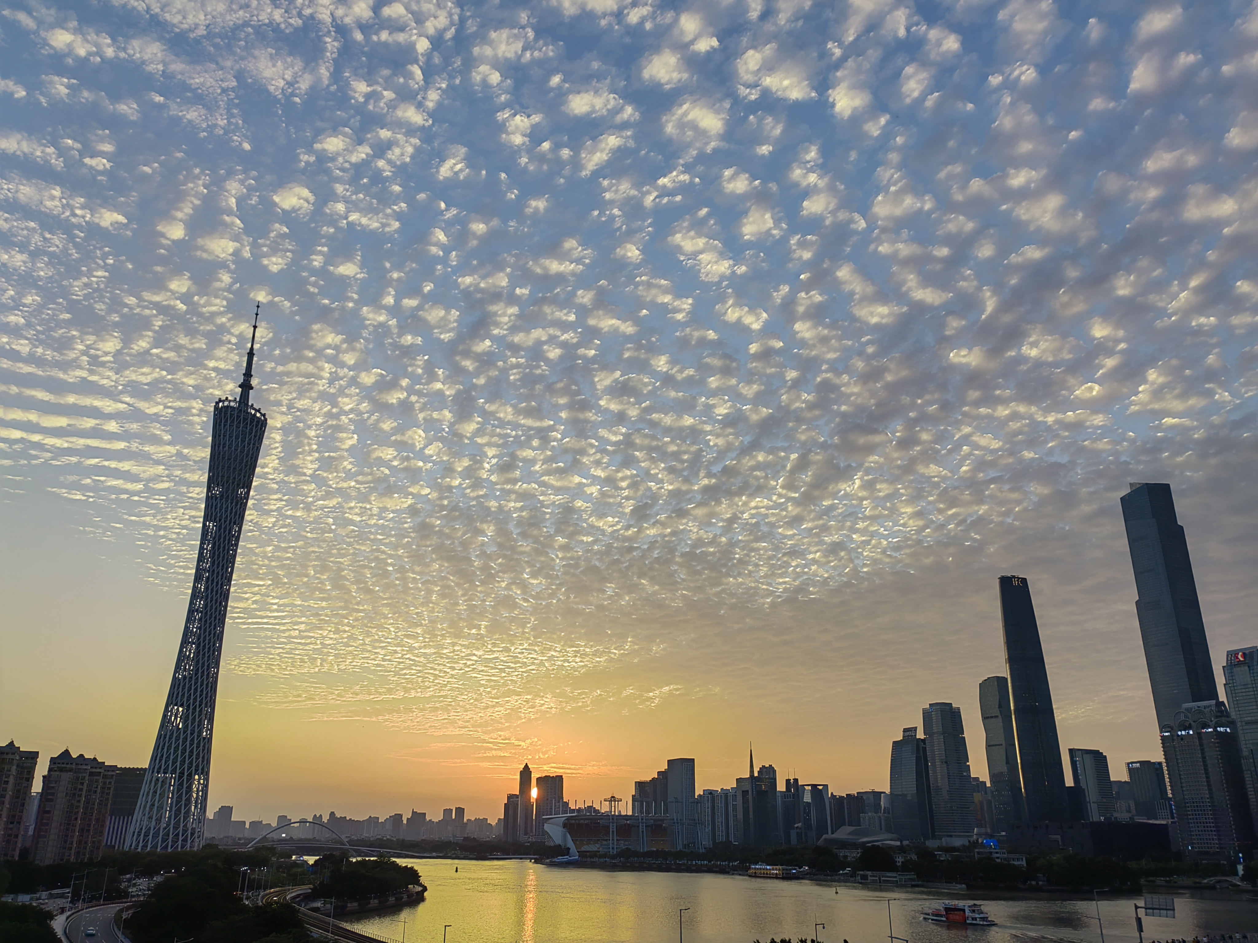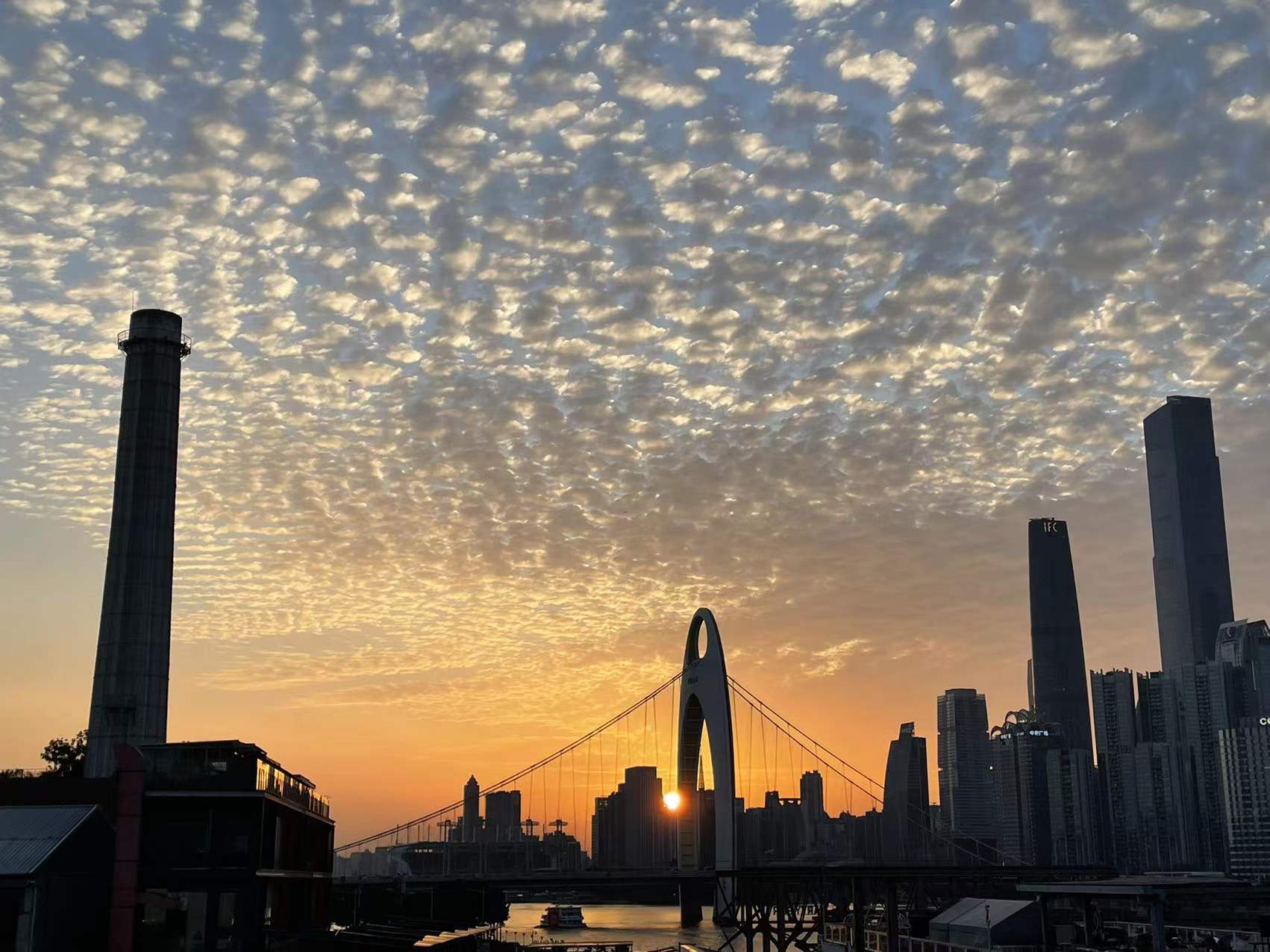 傍晚时分,夕阳染红了天边的鱼鳞云。粼粼波光,洒落珠江。广州日报·新花城记者苏韵桦 摄于琶醍