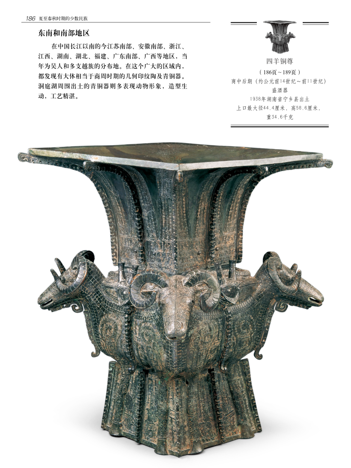 又如出土于湖南宁乡的商中晚期“四羊方尊”, 属于当时的“三苗”地区所产,被誉为“臻于极致的青铜器典范”,列名“青铜器十大国宝之一”。