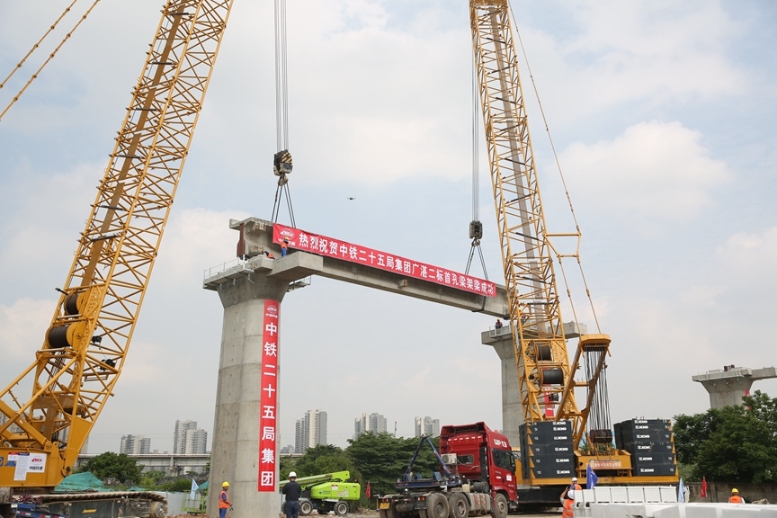 5月18日上午9时58分,在佛山市南海区狮山镇狮岭村,随着首片长24米、重103吨的预制T梁精准落位,由广湛公司建设、中铁二十五局承建的广湛高铁广珠广茂联络线进入架梁施工阶段。