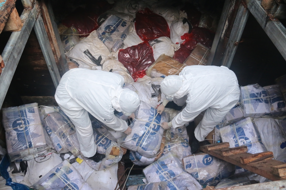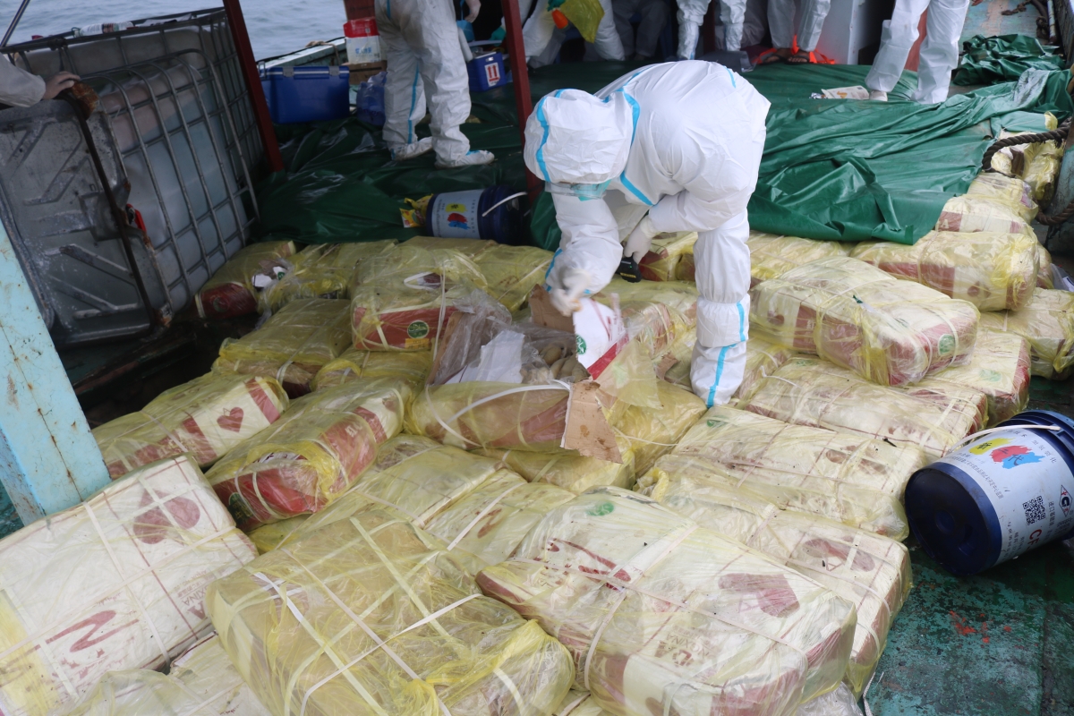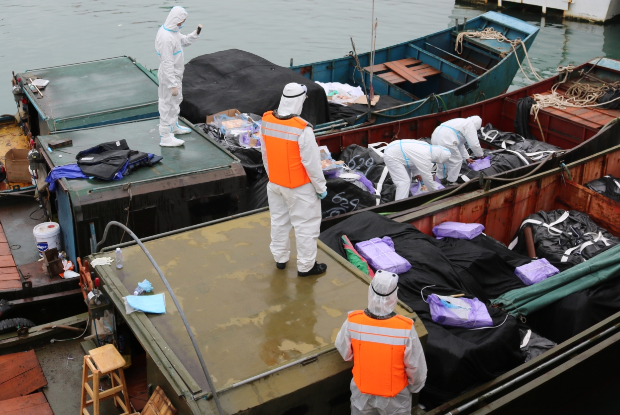 以上涉案船舶及所载冻品均未发现任何货物来源手续和检验检疫证明,涉嫌走私,已被执法员依法查扣。目前,均已协调地方政府与防疫部门完成冻品取样和消杀工作,涉案嫌疑人均已进行隔离,案件正在进行后续侦办工作。
