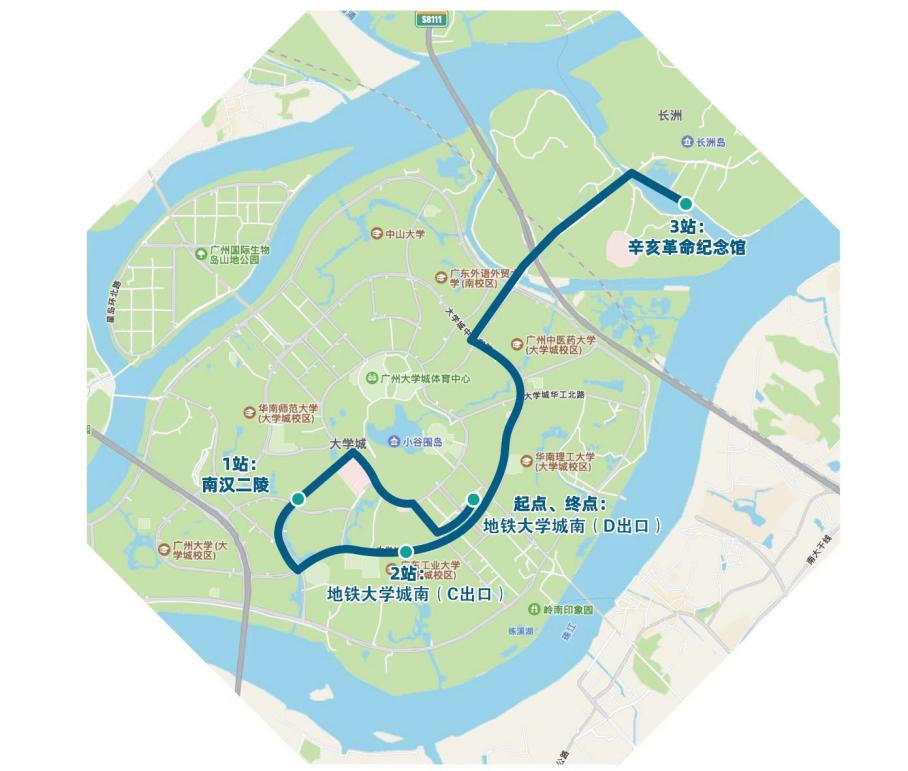 途经站点:地铁大学城南(D出口)、南汉二陵博物馆、地铁大学城南(C出口)、辛亥革命纪念馆、地铁大学城南(D出口)。