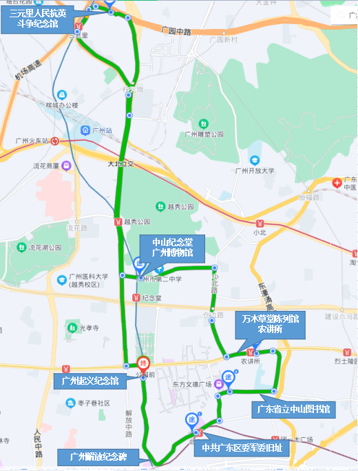 途经站点:起义路站(广州起义纪念馆、公园前地铁站)、三元里古庙站(三元里人民抗英斗争纪念馆)、应元路站(中山纪念堂、广州博物馆)、农讲所①站(万木草堂陈列馆)、农讲所②站(农讲所旧址)、中山图书馆站(广东省立中山图书馆、革命广场旧址)、万福西站(中共广东区委军委旧址、北京路地铁站)、海珠广场站(广州解放纪念碑)、起义路站(广州起义纪念馆、公园前地铁站)