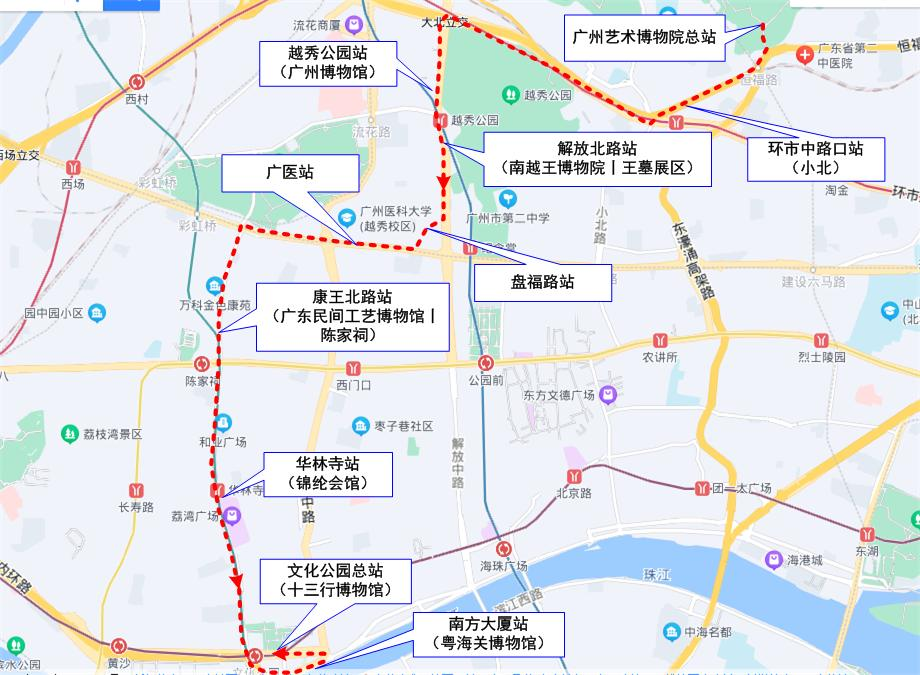 途经站点:广州艺术博物院总站——文化公园途经广州艺术博物院总站、环市中路口站(小北)、越秀公园站(广州博物馆)、解放北站(南越王博物院(王墓展区))、盘福路站、广医站、康王北路站(广东民间工艺博物馆|陈家祠)、华林寺站(锦纶会馆)、南方大厦(粤海关博物馆)、文化公园(十三行博物馆);文化公园——广州艺术博物院途经文化公园总站(十三行博物馆)、华林寺站(锦纶会馆)、康王北路站(广东民间工艺博物馆|陈家祠)、广医站、盘福路站、越秀公园站(广州博物馆)、小北站、广州艺术博物院总站。