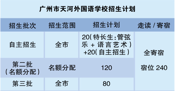 据介绍,今年广州市天河外国语学校计划招生240人,宿位可以满足全部高一学生。第一批次招收管弦乐类和语言艺术类特长生20人,自主招生名额为20人;第二批次名额分配计划招生120人;第三批次面向全市计划招生80人。黄南寿提醒初三学子们,要特别留意各类别的招生批次,让自己有更多的机会报考心仪的学校。