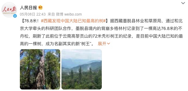 最近,有关树木的两项纪录被刷新!在墨脱县境内的背崩乡格林村记录到了一棵高达76.8米的不丹松,是目前中国大陆已知的最高的一棵树。