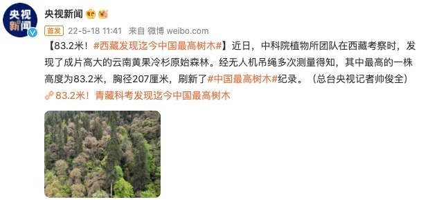 近日,科考队又发现了成片的云南黄果冷杉原始森林,经无人机吊绳多次测量得知,其中最高的一株高度为83.2米,胸径207厘米,刷新了中国最高树木纪录。