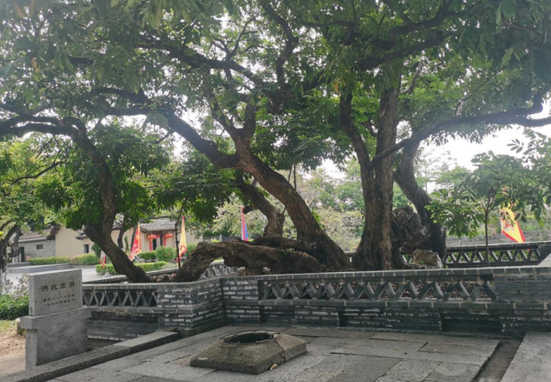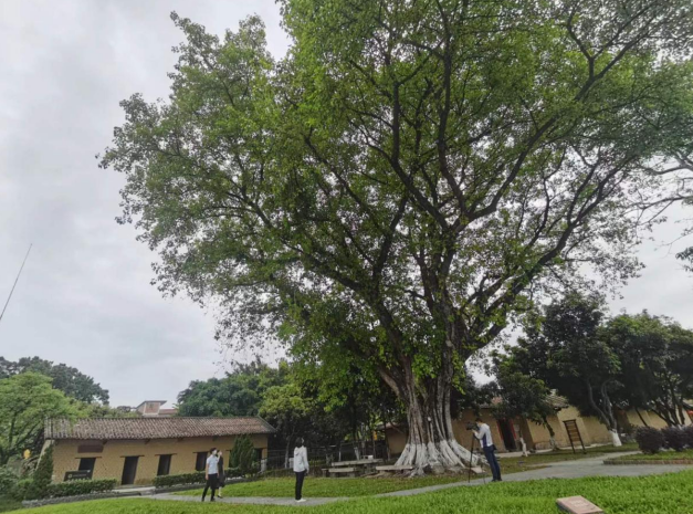 洪秀全故居里还有一棵123年的心叶榕树,由于叶子长得像心形,所以叫心叶榕。这棵心叶榕树干粗壮,要3个成年人才能合围。树高10几米,冠幅有几百平方米,远远望去就像一把大伞,非常的壮观。