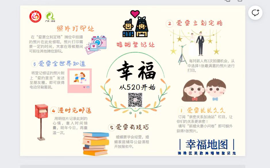 有意思的是,在5月20日当天,虽然因疫情防控需要,无法同步开展线下婚姻辅导服务,但广州全市十一个区还是通过各种方式传播婚姻家庭经营小知识。南沙区民政局婚姻登记处为新婚夫妇派发《为爱导航·开启幸福婚姻的金钥匙》宣传资料、举办“幸福南沙·爱在家庭”线上婚姻专题讲座,番禺区民政局婚姻登记处编制婚姻家庭经营基本知识学习资料和答题卡,海珠、天河区开展婚姻家庭辅导公益课程。