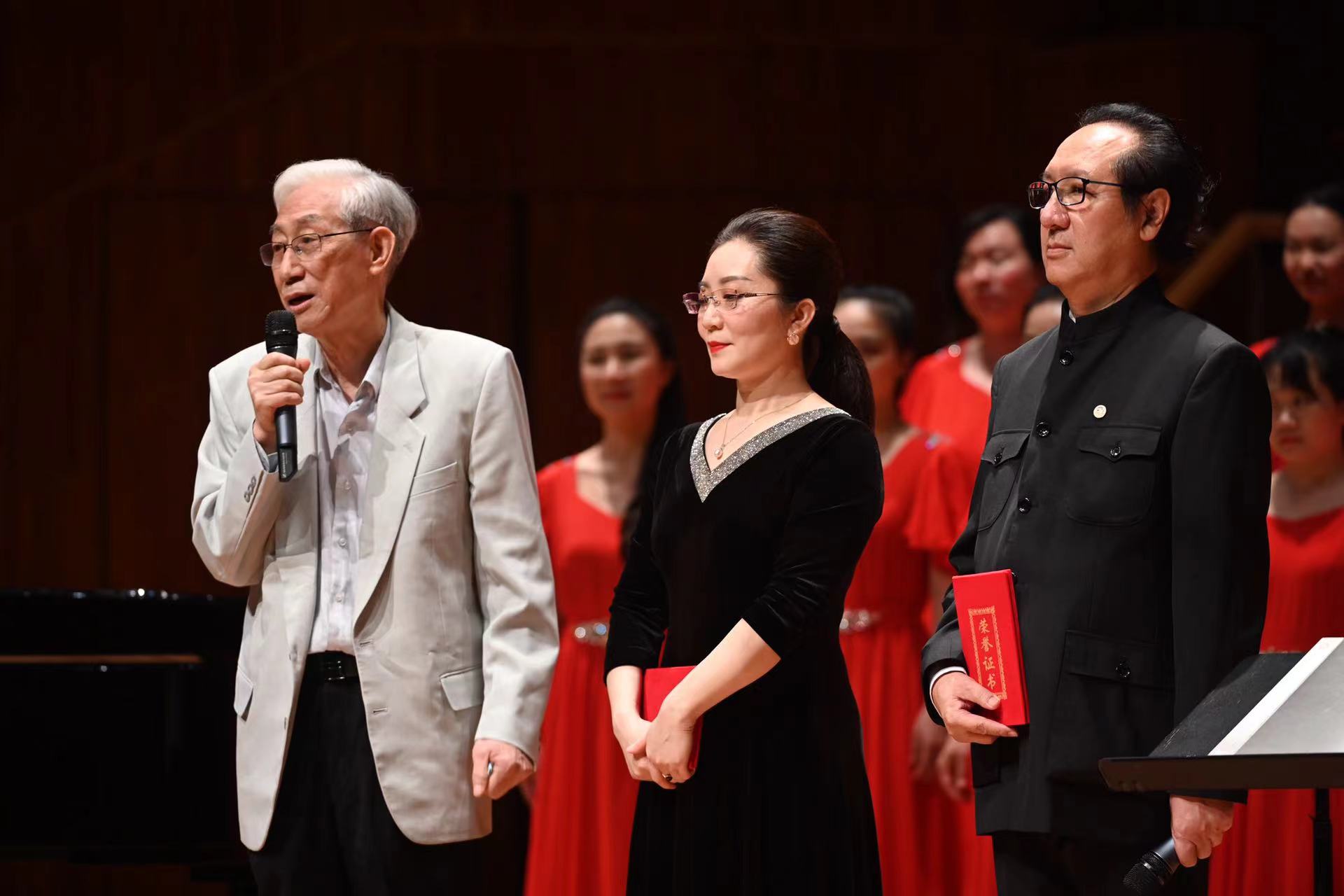 “能够举办这场音乐会特别地不容易。我要衷心地感谢大家!”吴颂今给音乐会三个主办方颁发了荣誉证书。随后,吴颂今、苗向阳会长、音乐会演出总监常清将证书发给了参演指挥、伴奏、领唱和合唱改编的作曲家。