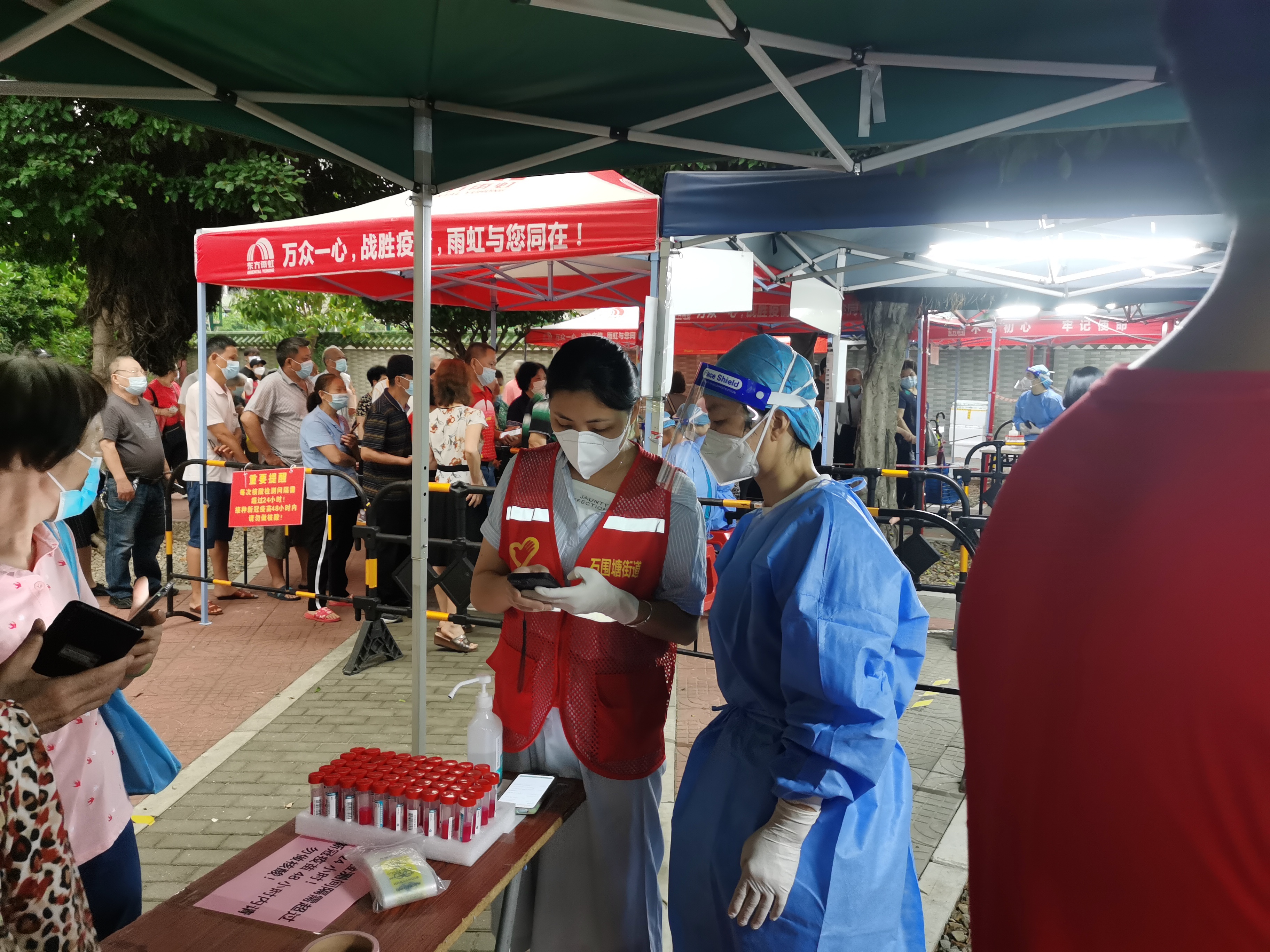 回到21日下午的检测现场,如注的暴雨越下越大,人群都急急忙忙躲到帐篷下。扫码员一边快速给大家扫码,一边不忘配合秩序员们认真维持队伍秩序。此时,检测点现场风大、雨大、群众的吆喝大,但最洪亮清晰的声音,却还是来自现场志愿工作者们从容有力的指挥引导声。“好,您请过来。”“麻烦请站开一点,不要拥挤。”“阿婆,不用急,我来帮你。”“对,下一个过来。”
