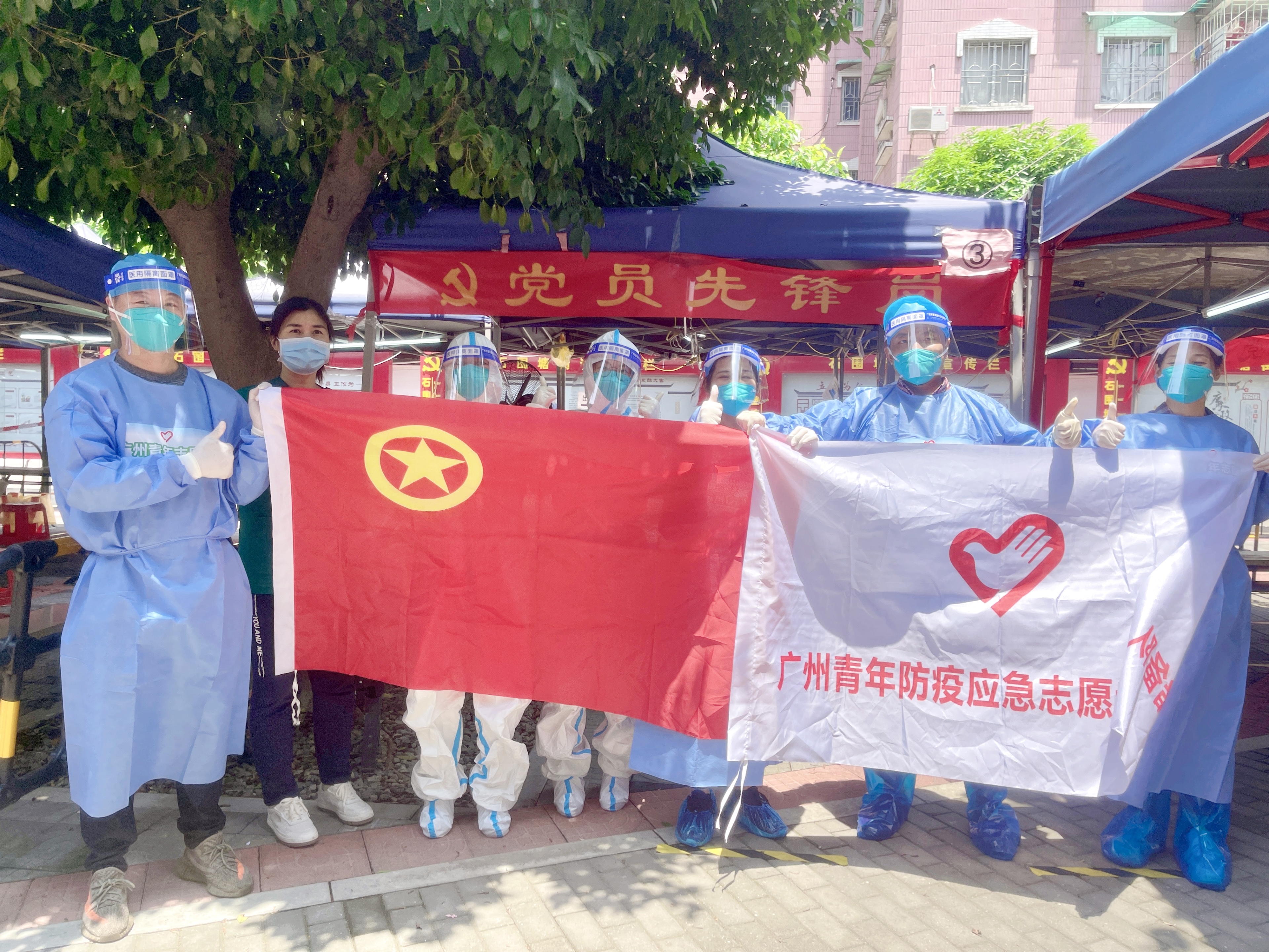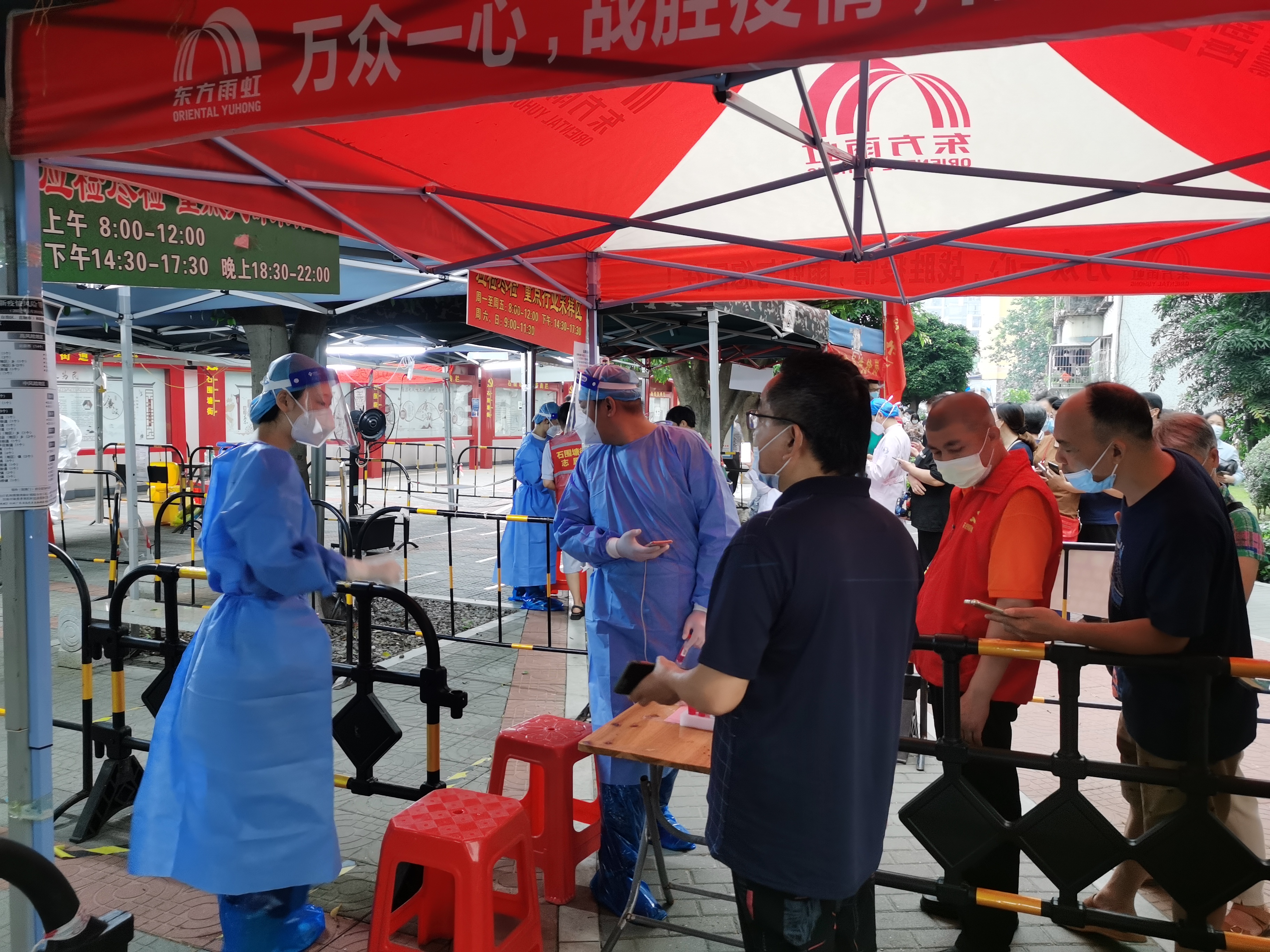 5月21日,又一次近万人规模的核酸常规检测工作在荔湾区石围塘街桥东小区展开。天公不作美,入夏正午的山雨欲来,天气阴沉,所有场地布置、医护物资均已到位,大家都在紧张忙碌地检查降雨防备,或者快速换装。此时,一群笑容爽朗光,身姿挺拔的青年出现。和此前团市委依托广州市志愿者行动指导中心、广州青年志愿者协会组织发动的广州青年防疫应急志愿者储备队志愿者一样,这是当天下午第一批过来四名志愿者,晚上6点,另四名志愿者准时到达。