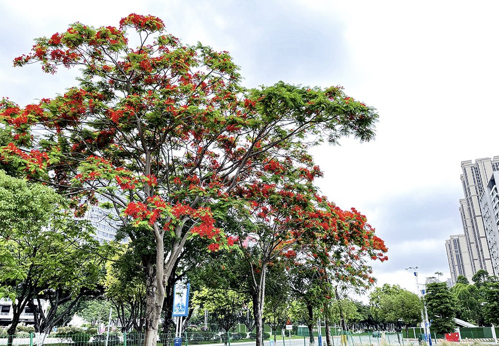 近日,记者走在番禺区亚运大道的街头上发现一棵棵凤凰木繁花绽放,点缀了路边,十分显眼,吸引不少市民前来打卡拍照。