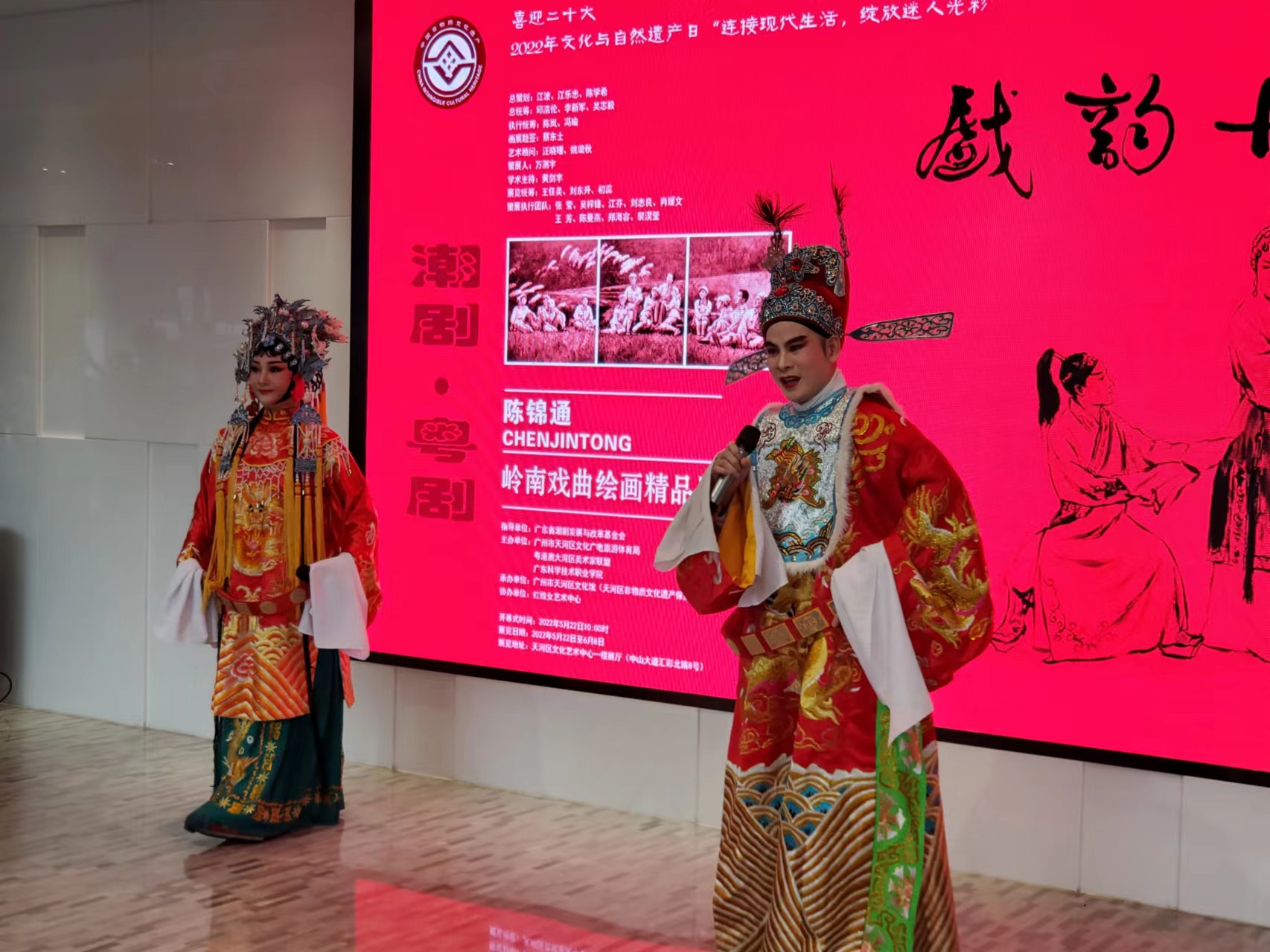 现场,一段精彩的潮剧演出拉开了展览的序幕。粤剧名家红线女的《昭君出塞》与潮剧名家姚璇秋的《扫窗会》等名作被绘成生动的作品在画展上展出,吸引了观众驻足欣赏。