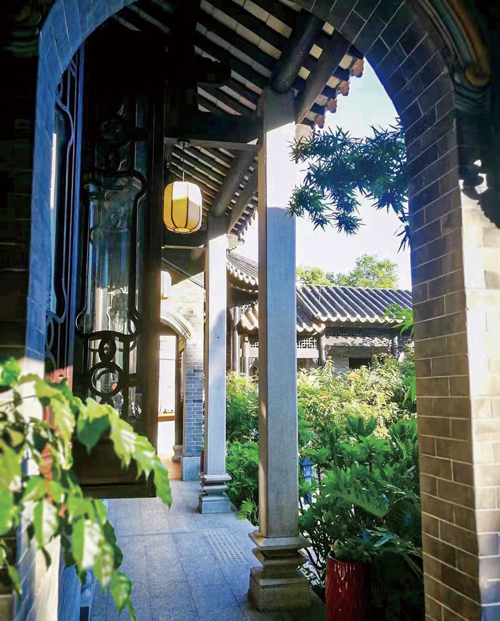 入园便是廊,只见这里红砖铺地,楠木为柱,檐上斑驳。羲园建筑的设计参照了广东四大名园的岭南古典园林建筑风格。三进三出的广府院落里,荟萃了亭、榭、堂、轩、馆、艇、舫等中国古典园林建筑形式,一应俱全。园中暗含的“内街”设置更使园林增加了街景、内径、涌景等更为丰富的空间变化。