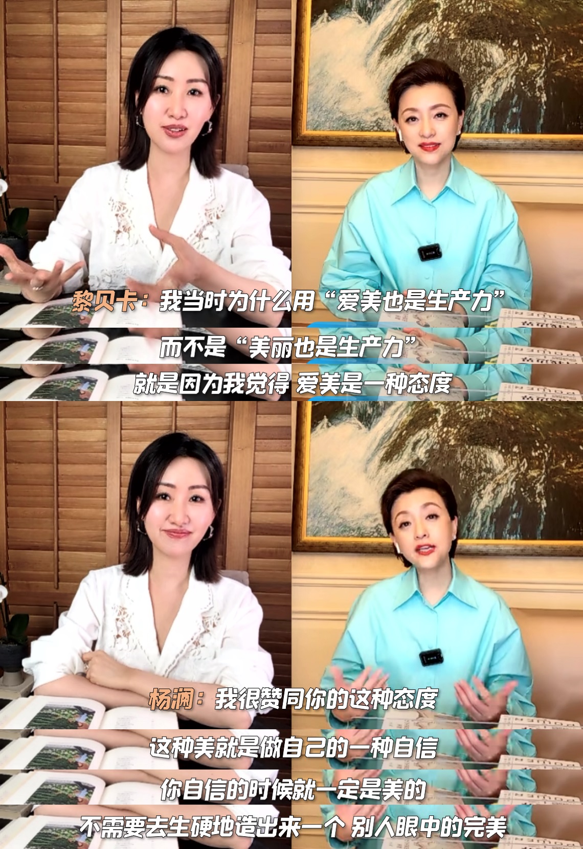 谈及书名《爱美也是生产力》,黎贝卡说,“当时为什么用‘爱美也是生产力’,而不是‘美丽也是生产力’。是因为我觉得爱美是一种态度。这里的美也不光是说外表美,而是一个由内到外的系统工程。爱美其实讲的是一个生活态度,爱自己也热爱生活的人就是很美的,相信自己值得更好的,我们才会为实现它去努力。”杨澜听到后表示,“我很赞同你的这种态度,即使爱美,这种美也是做自己的一种自信。你自信的时候就一定是美的,而不需要生硬地造出来一个别人眼中的完美。”