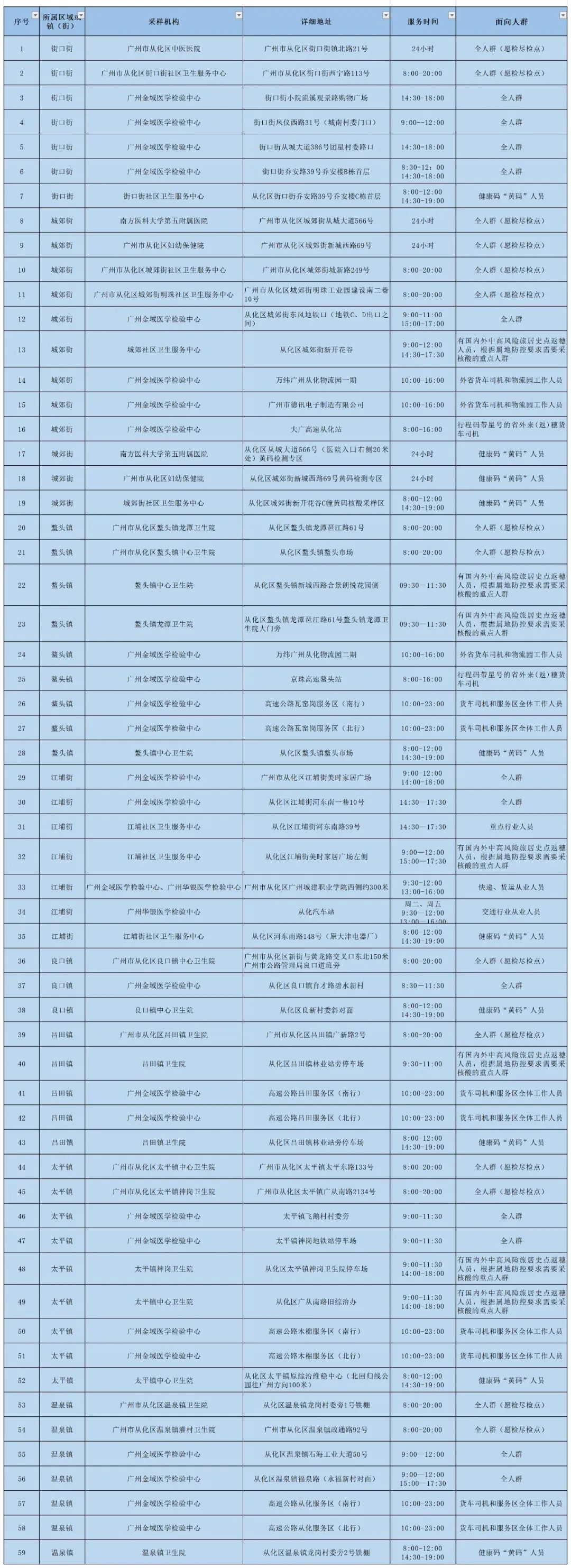 根据从化的人口分布特点和地理形态,在其中选取59个检测点,作为15分钟核酸检测圈的试点,方便群众就近就便进行核酸采样。