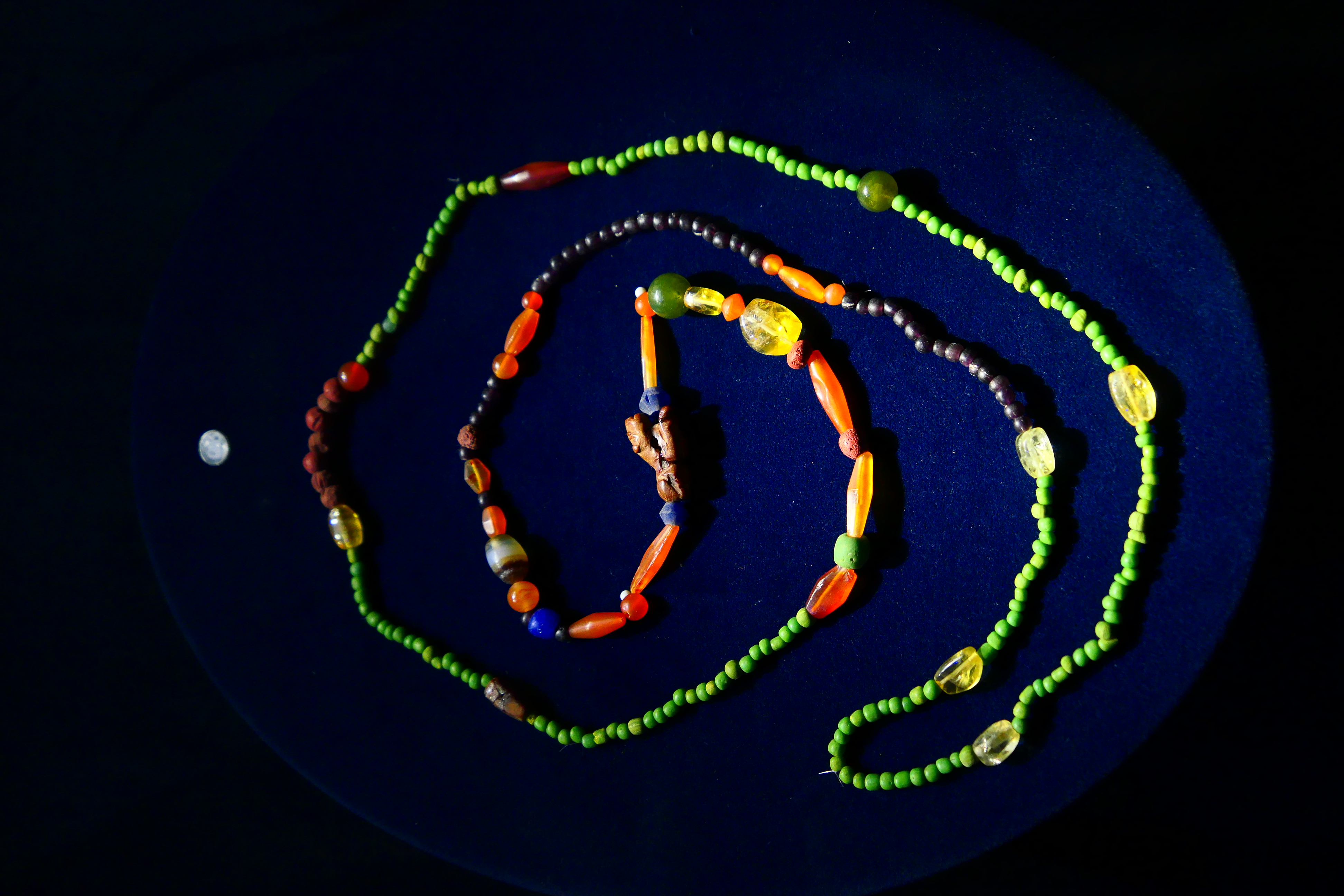 据了解,广州考古出土两汉时期珠饰两万余颗,它们材质丰富、形制多样、色彩斑斓,且来源广泛,见证了岭南与周边地区,特别是与东南亚、南亚、西亚及地中海沿岸地区通过海路进行的贸易往来和人文交流。