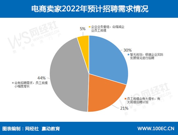 在电子商务领域,电商企业人才缺口依然存在。国内专业数字产业产教融合协同育人机构——赢动教育近日发布了《2021年度中国电子商务人才状况调查报告》。报告显示,超六成电商卖家存人才缺口,两成企业有大规模招聘计划。