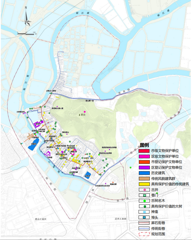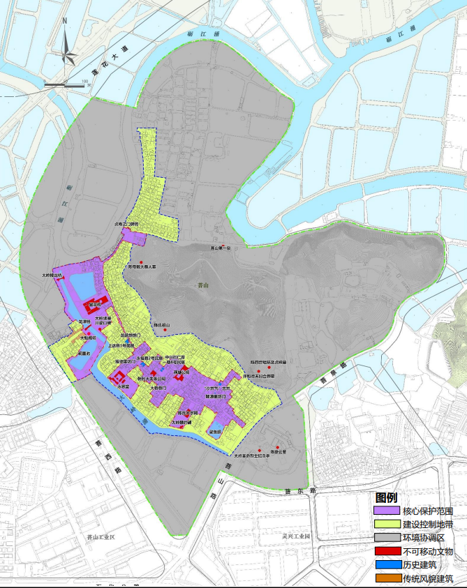 以规划道路和自然环境为边界,结合山水环绕的自然景观环境格局,将大岭涌、大岭墟场等区域划入建设控制地带,西至菩西路,东至菩山路,北至繁华东街,总面积为12.31公顷。