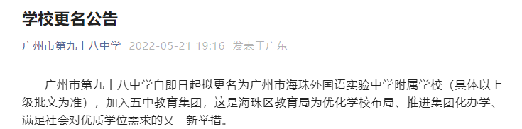 5月21日,广州市第九十八中学发布公告,称拟更名为广州市海珠外国语实验中学附属学校(具体以上级批文为准),该校将加入广州五中教育集团,是海珠区教育局为优化学校布局、推进集团化办学、满足社会对优质学位需求的又一新举措。