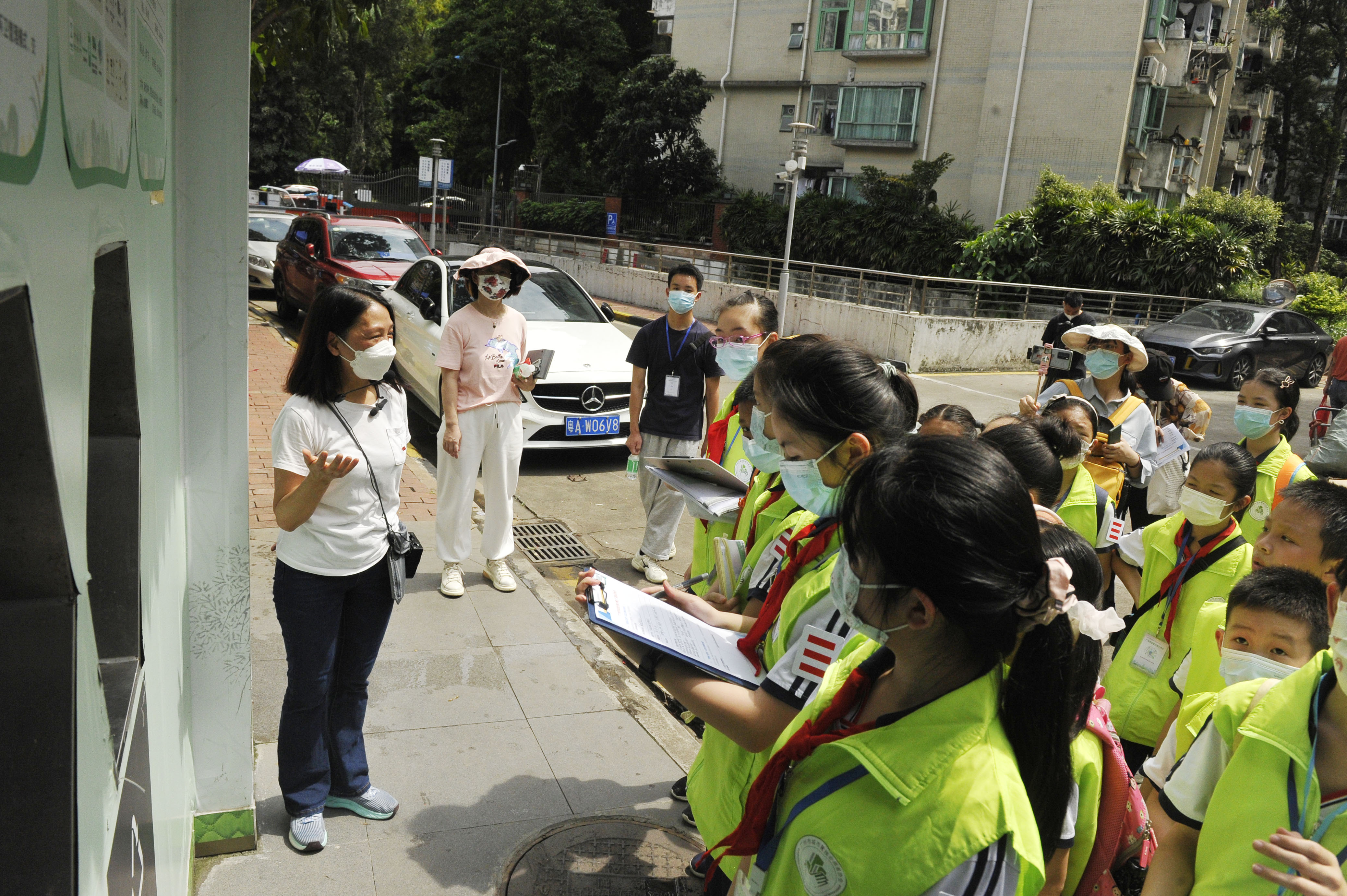 活动中,学生们通过实地走访游学的形式,对垃圾分类有了更直观的认识。其中一名同学表示,“我就住在这个小区,平时大家丢垃圾都是分类投放的,只有我们身体力行做好垃圾分类,才能共创美丽家园。”