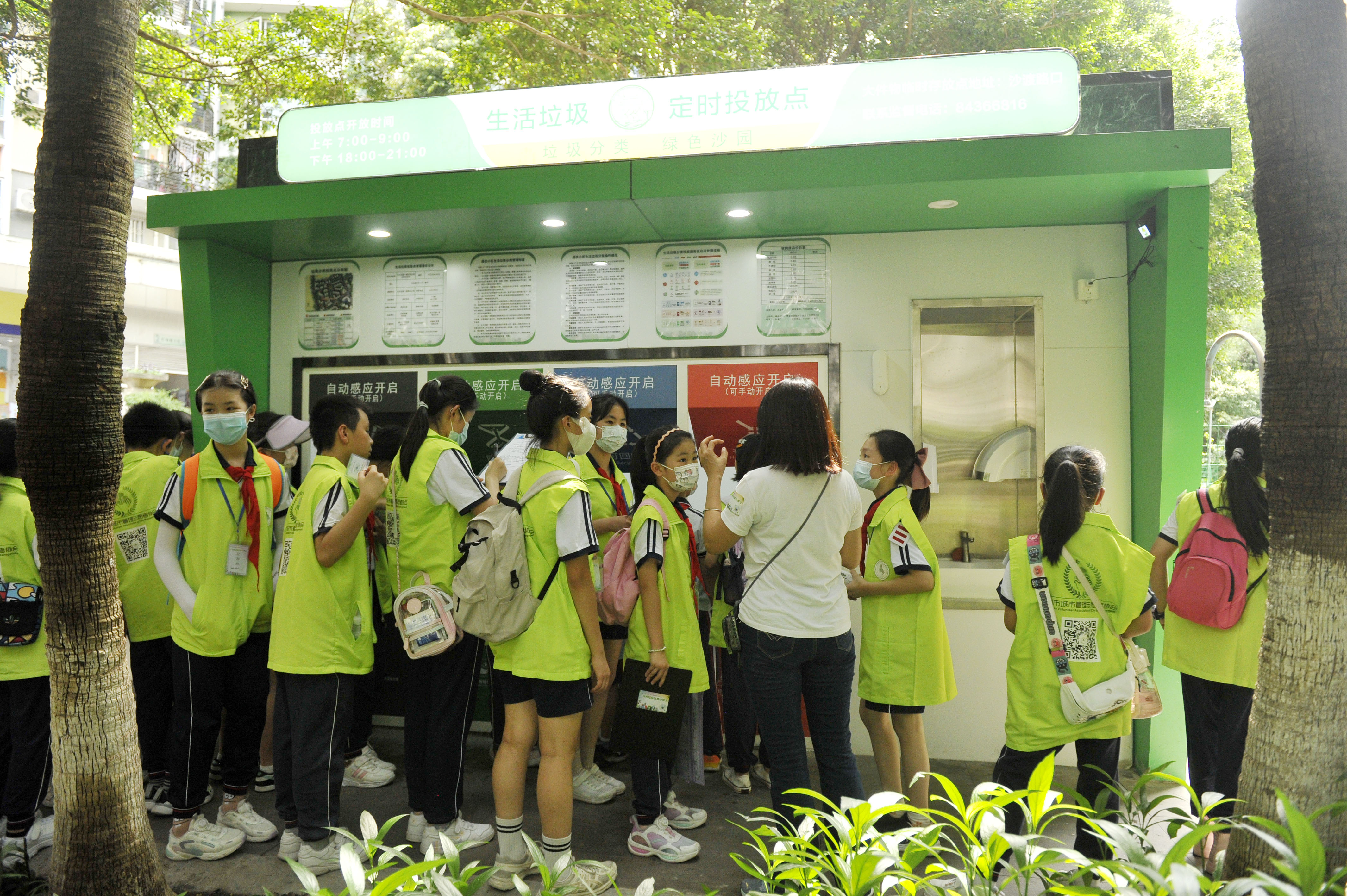 到小区参观垃圾分类投放点。信息时报记者 郭柯堂 摄