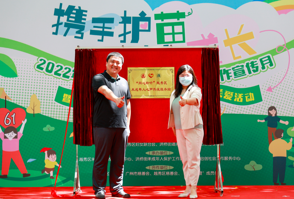 启动仪式上,在广州市志愿者协会和越秀区民政局的共同发起下,“同心聆听”越秀区未成年人心声热线服务站揭牌。服务站设在洪桥街的未成年人保护站里。洪桥街道办事处副主任李密说:“设热线服务站的起源是洪桥街护苗联盟的成立。我们邀请辖内的单位、社会机构等力量加入护苗联盟这棵大树中,一起来守护辖内8335名未成年人。”