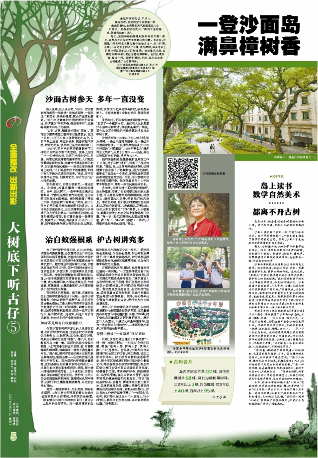 今年,沙面小学还特地开展“小树长”实践活动,将沙面古树按照榕、樟、桉等种类“分派”到五年级小学生手中,引导他们每个月开展一到两次观察,记录关于病虫害和枝叶生长的情况,及时向社区反馈。“我们还计划将‘小树长’实践推广到其他校区,把爱护生态的理念推广开来。”刘湛泉说。