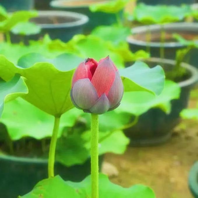 因花色红艳,花期特长,可延至“十一”国庆节而得名。花态为飞舞状。花色为深红紫色,基部淡黄色。雄蕊较多,附属物小,乳黄色。雌蕊心皮13~24枚,多泡状,不结实。青熟花托杯形,绿色。“国庆红”并蒂莲还在含苞待放中预计下周开花。