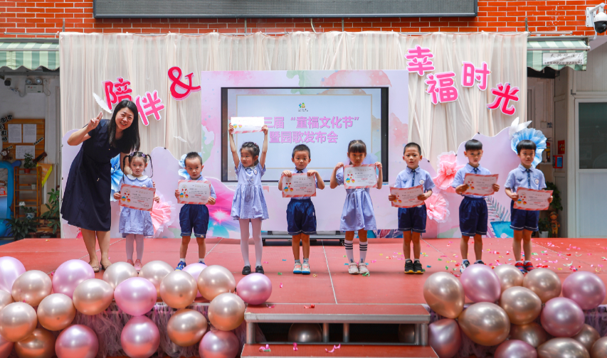 活动上,随着吉祥物“福儿”和“悦儿”在屏幕上轻轻一点,园歌《小乖乖》正式发布。“我的小乖乖,皮肤嫩又白。每次见到他,只想抱入怀。水灵的眼睛,充满了期待。每当笑起来,乌云都散开……”轻快的旋律加上一幕幕温暖、欢乐的画面,全场嘉宾、教师、幼儿和家长都情不自禁地跟着旋律哼唱起来。