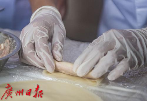 粤菜师傅现场演示制作春卷。